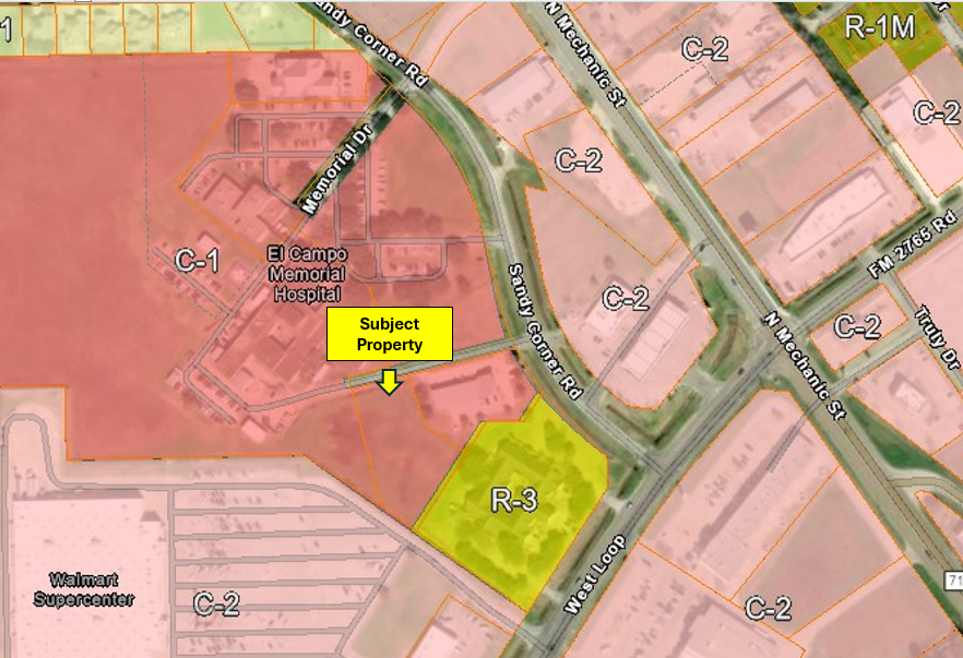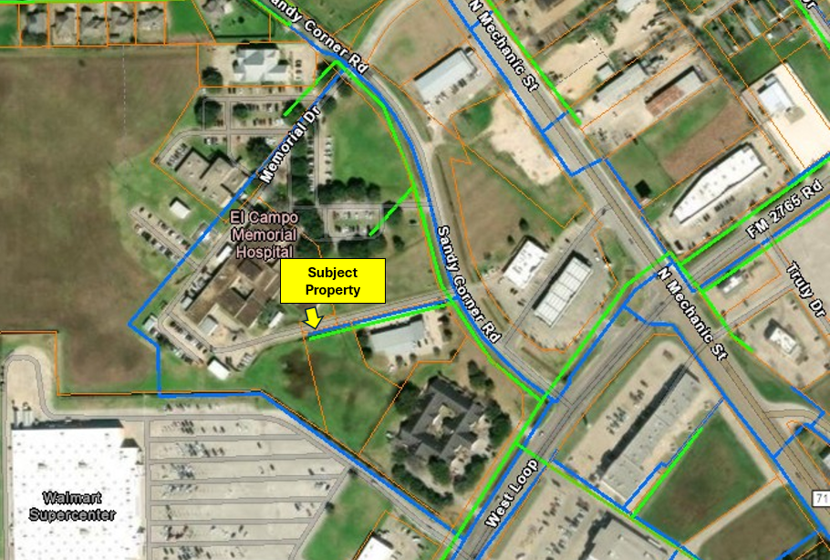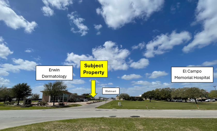 This commercial lot is nestled in between a bustling medical community with the El Campo Memorial Hospital and Clinic facing the front and Erwin Dermatology next door. Walmart is located behind the property.