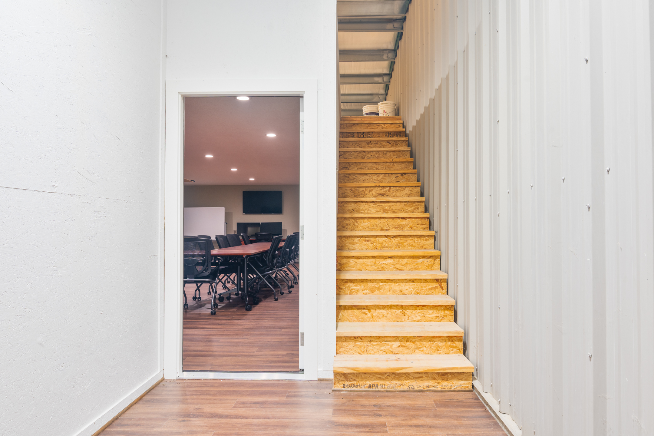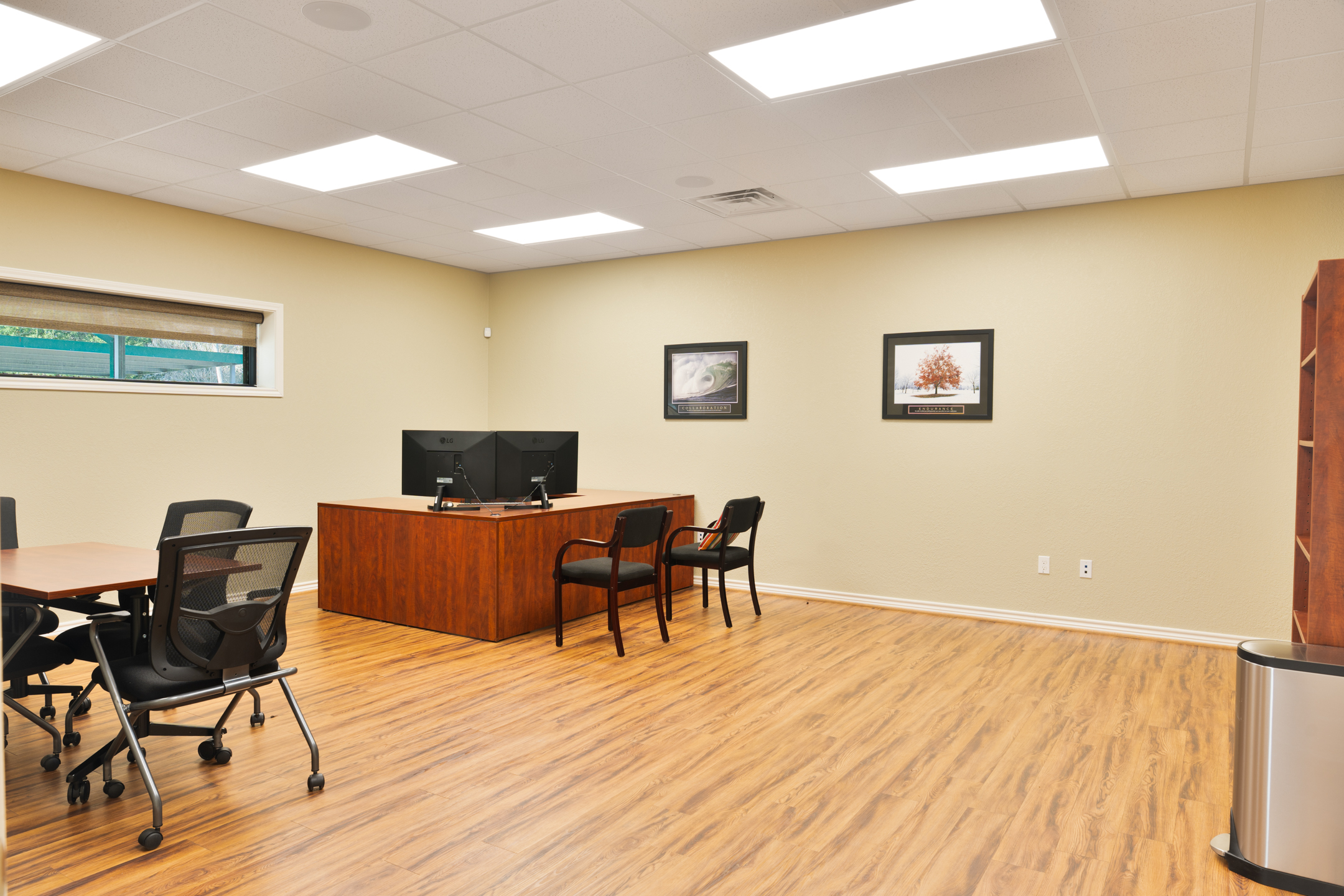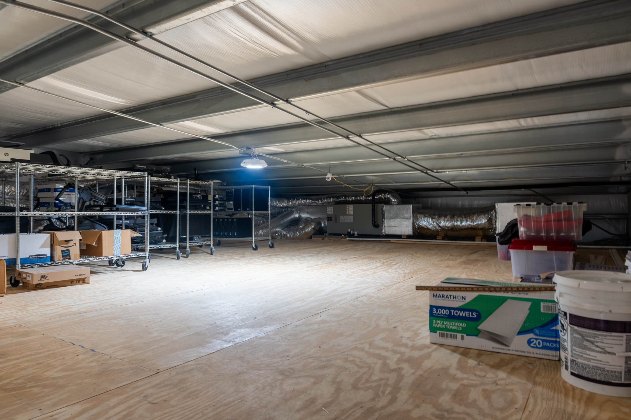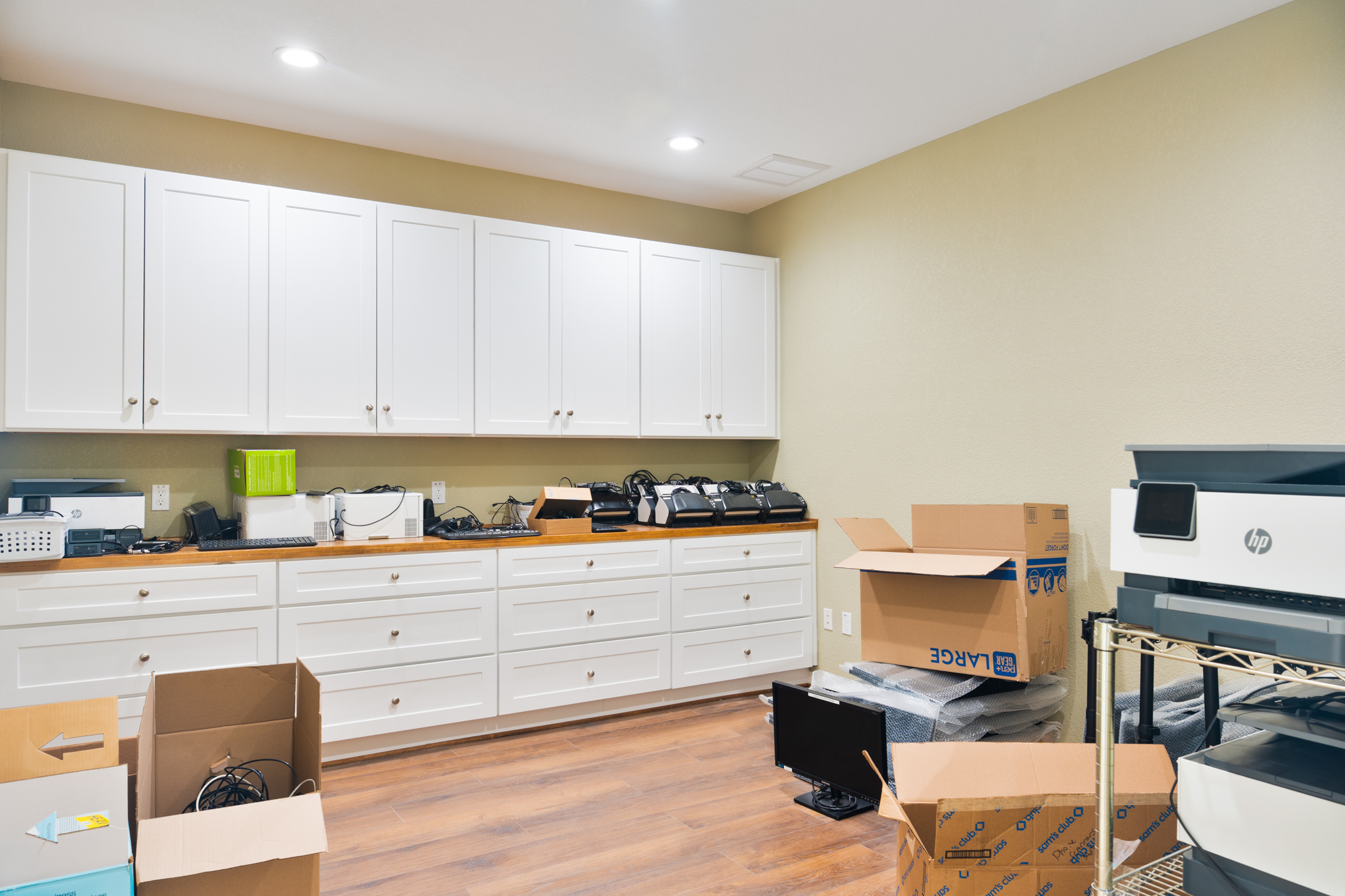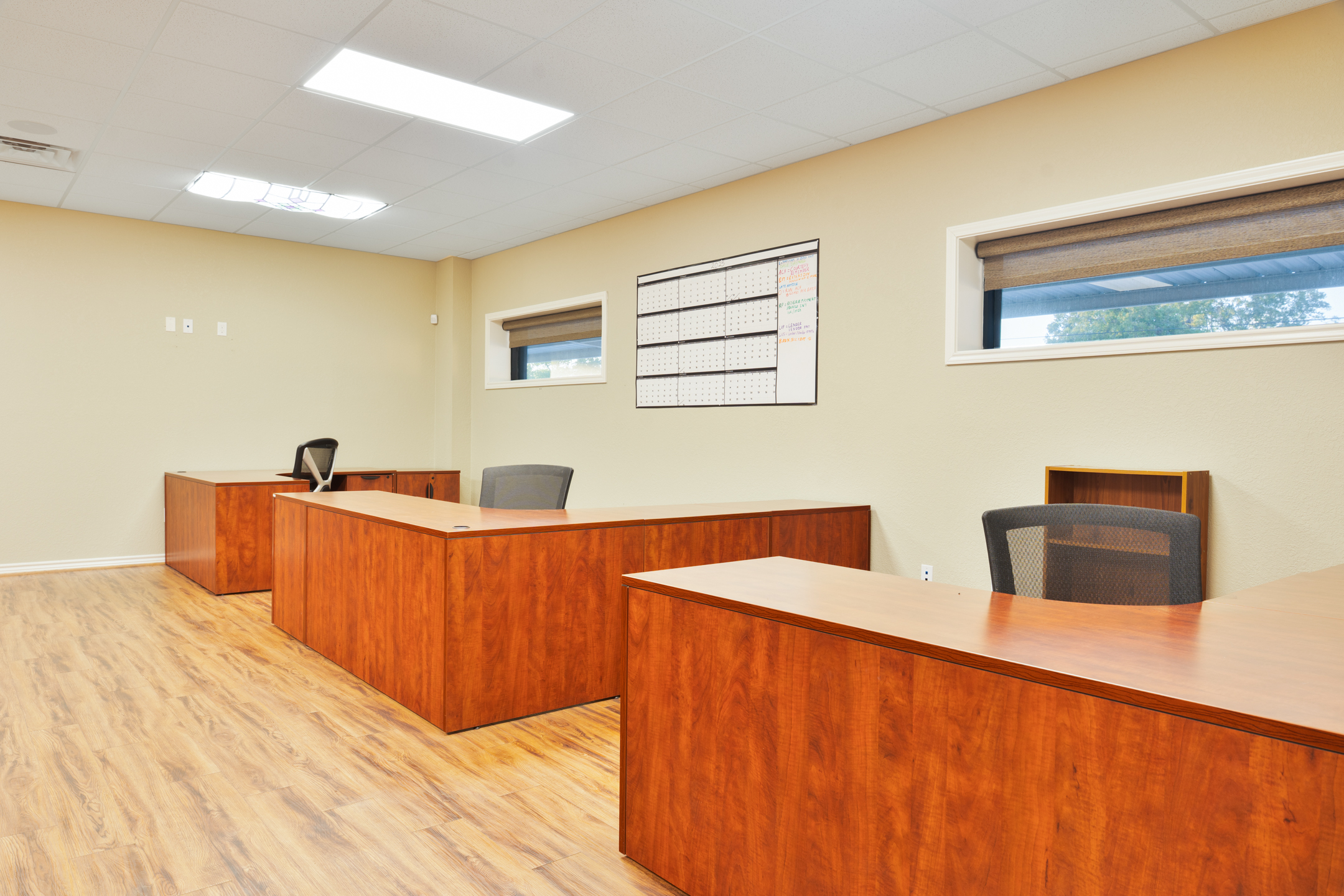 The building includes a dedicated kitchen/break area, multiple restrooms, a network/server room, and ample storage throughout. Additional upstairs storage space provides convenient overflow without sacrificing functional office area. Two additional side entrances to the building are located under the covered parking for easy access to offices near the back of the property.