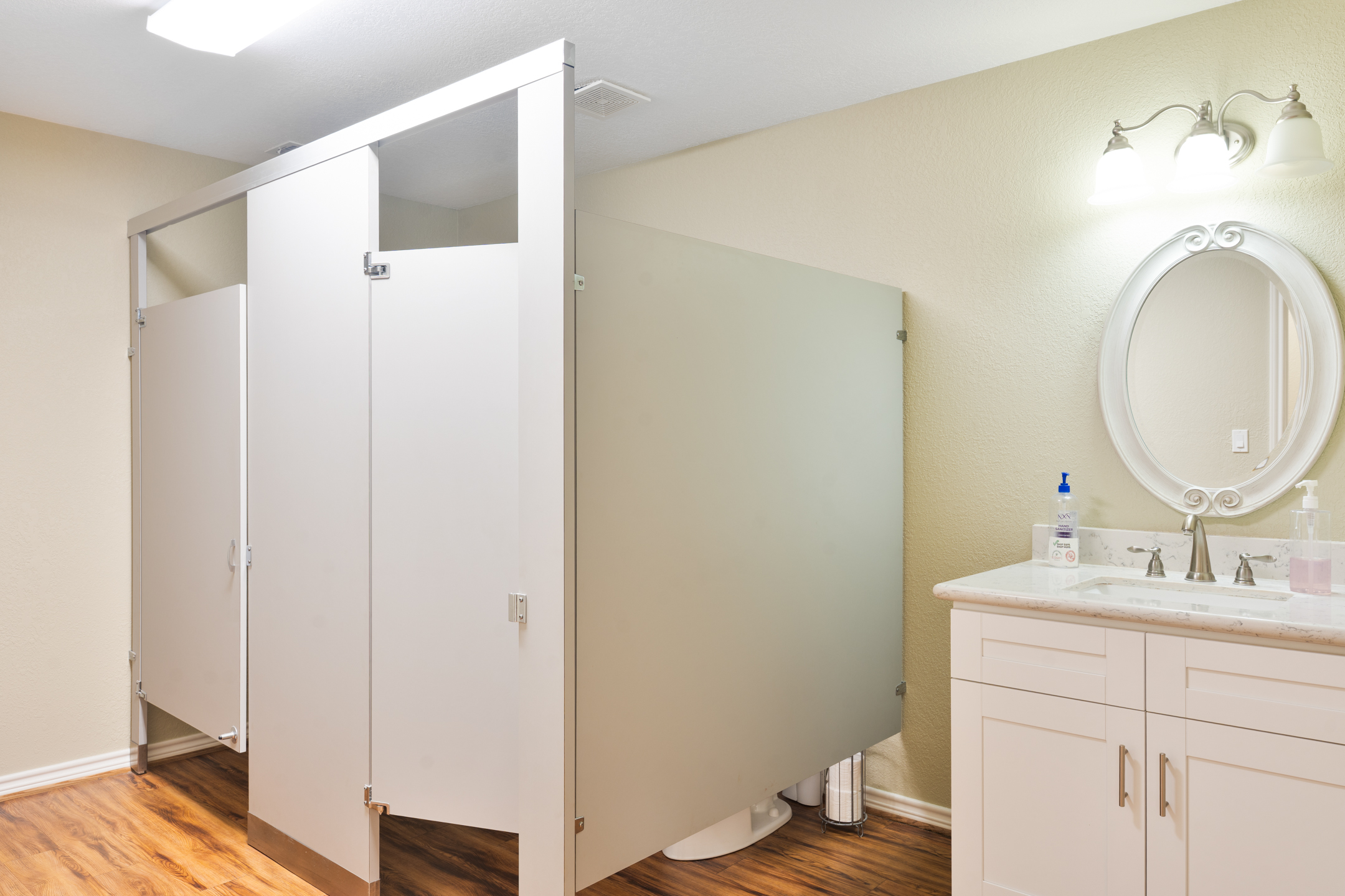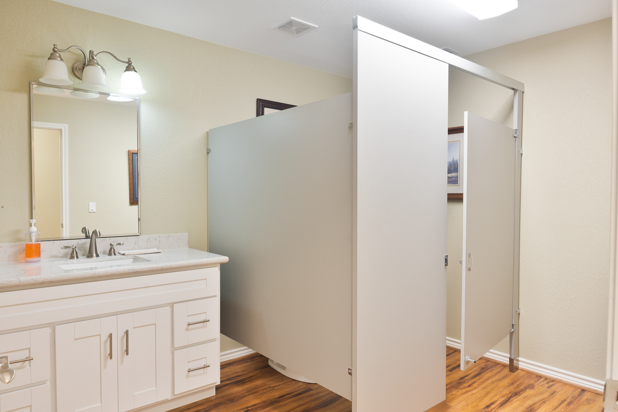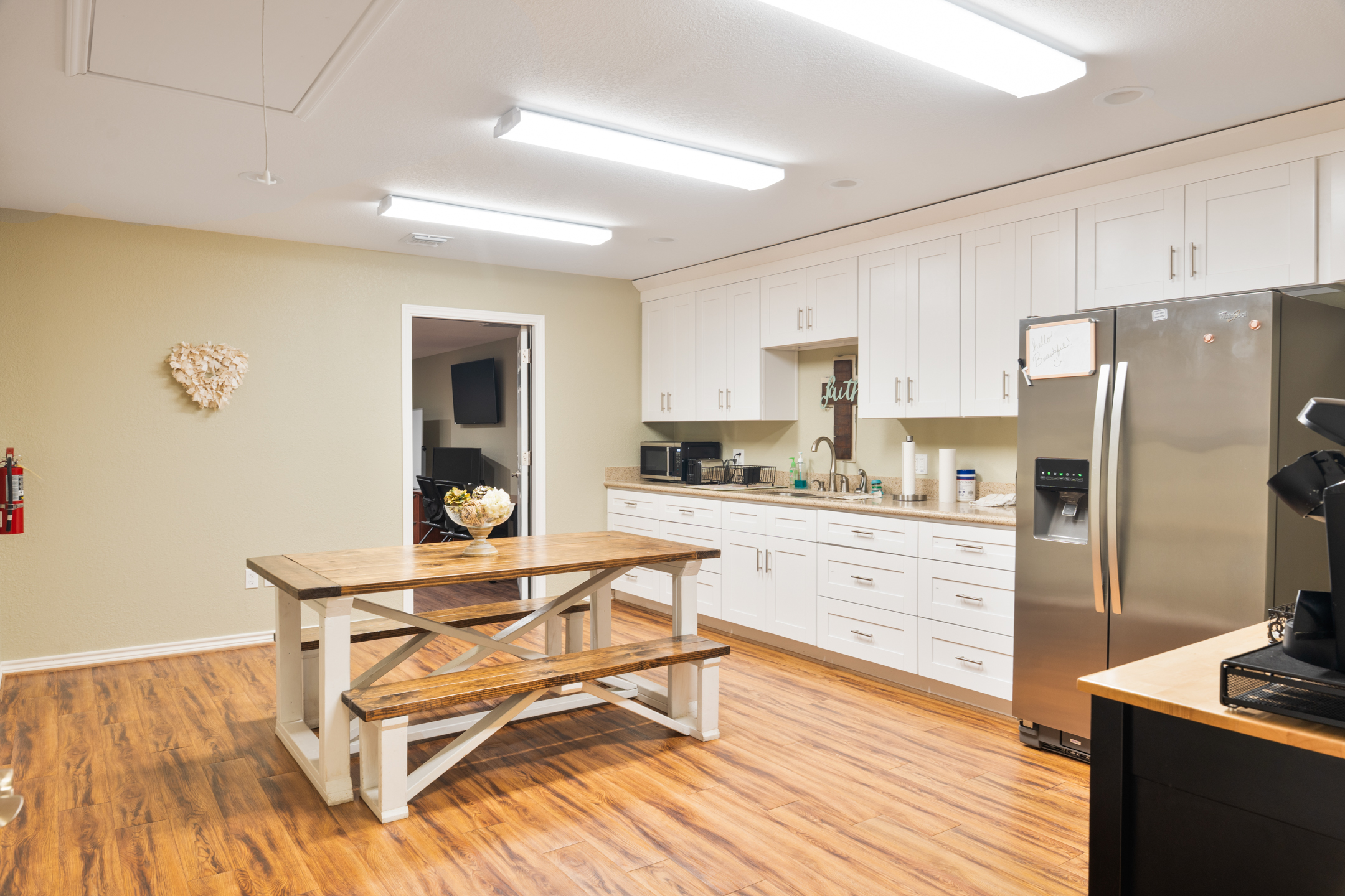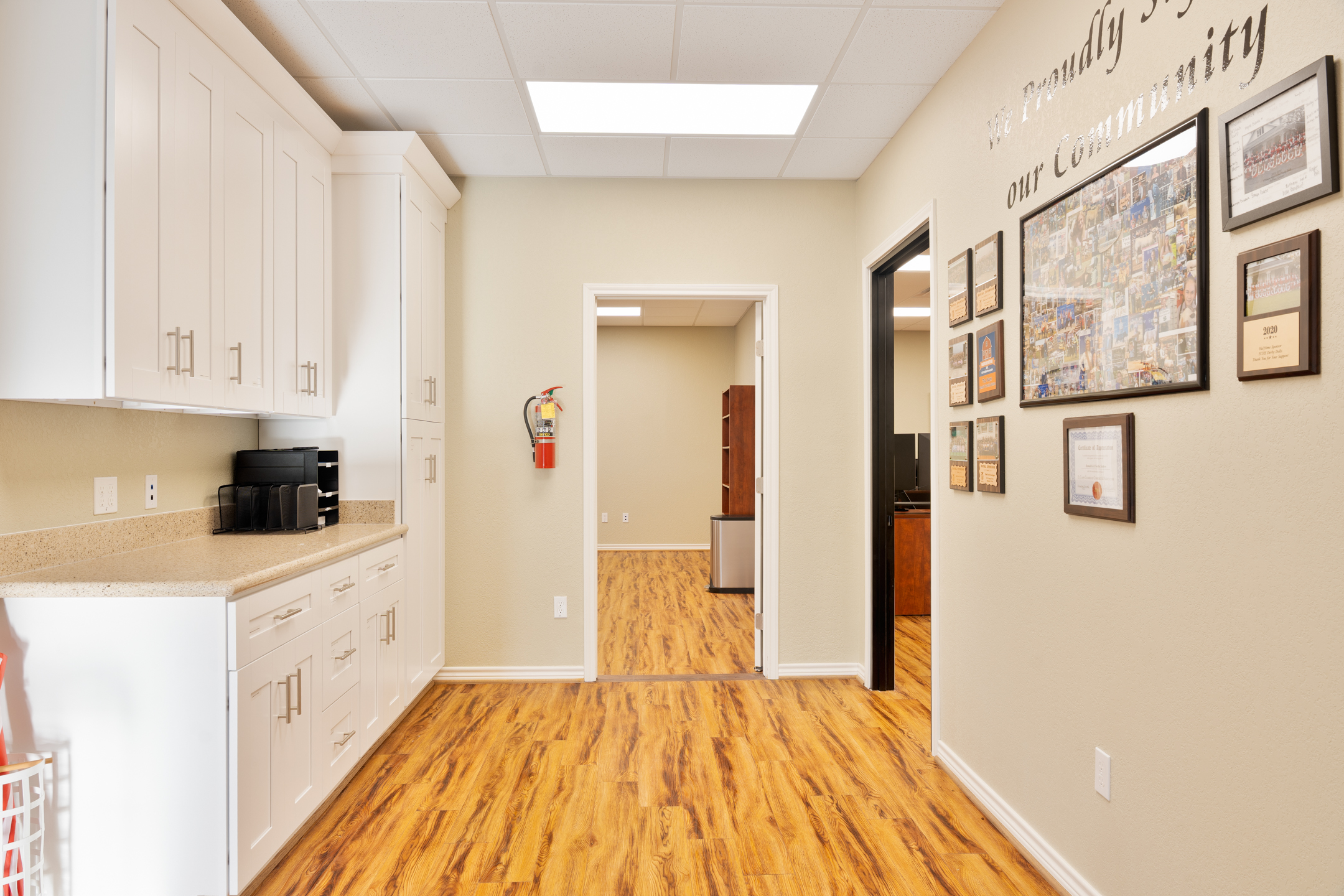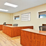 The building includes a dedicated kitchen/break area, multiple restrooms, a network/server room, and ample storage throughout. Additional upstairs storage space provides convenient overflow without sacrificing functional office area. Two additional side entrances to the building are located under the covered parking for easy access to offices near the back of the property.