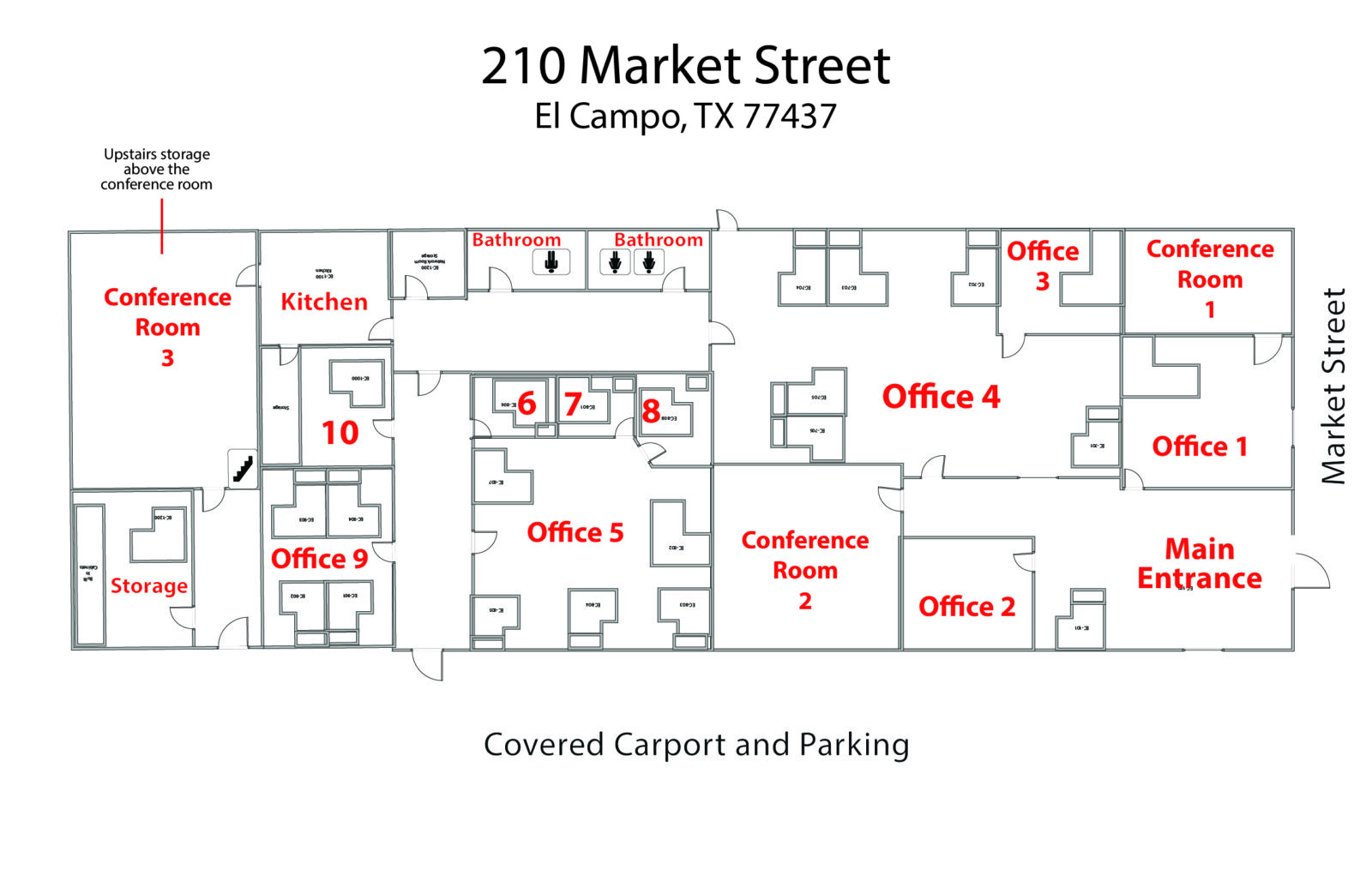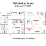 Positioned on an oversized corner lot within the city limits of El Campo, this well-maintained 5,000 sqft commercial office building offers exceptional flexibility for a variety of business uses. Thoughtfully designed for productivity and flow, the layout features numerous private offices, open work areas, and 2 large conference rooms ideal for team collaboration and client meetings.