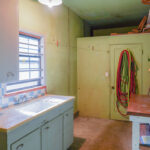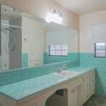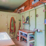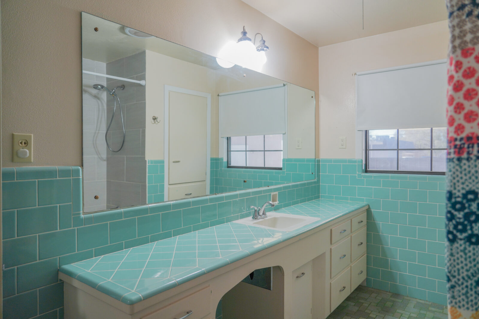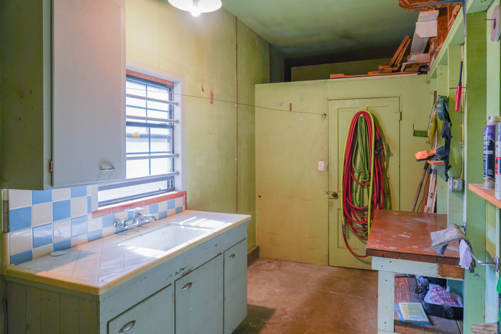 - Original vibrant, colored tiles in the kitchen, bathrooms, and workshop