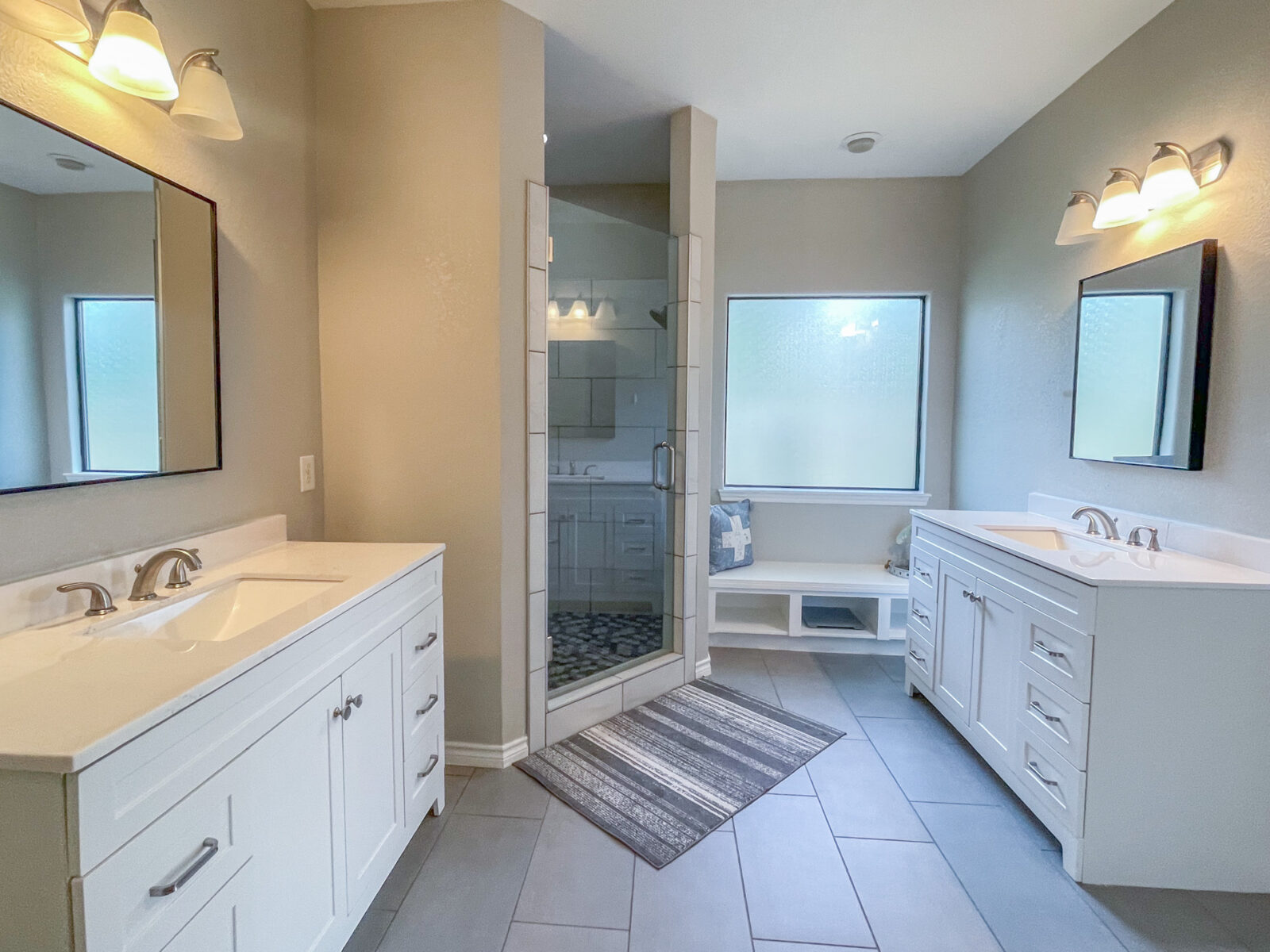 With a split floor plan, the primary suite provides privacy and comfort. The ensuite bathroom features an oversized standing shower, his and her sinks and vanities, and a large walk-in closet. The other 3 bedrooms can be found on the opposite end of the home and share a full bathroom with a tub/shower combo.